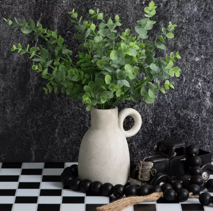Give your space a boost of garden beauty with this Eucalyptus Bush. This bush features a segmented stem that branches out into round leaves. The leaves have subtle changes in color and are dusted in a white coating for a realistic look. Incorporate it into your mantel or tabletop displays, or use it to make a floral arrangement full of delightful color and textures!