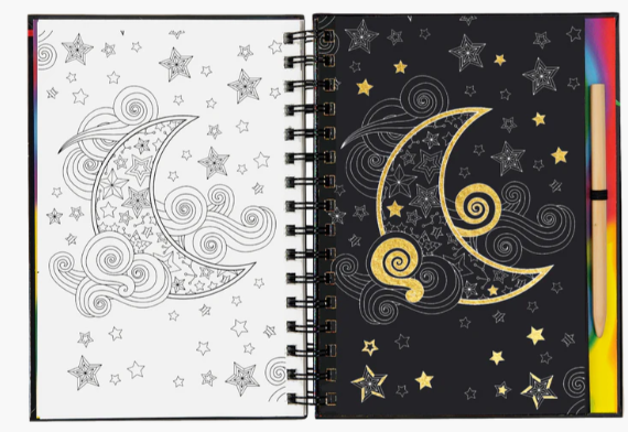 As you trace the artwork on the black-coated pages, a wolf, a mandala, a night sky, a unicorn, and more emerge in sparkling foils and colorful swirls!
