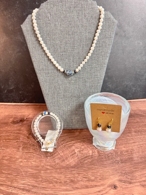 Coordinates with 98 Pearl, Lapis & Porcelain bead Necklace & 100 Pearl & Lapis Earrings