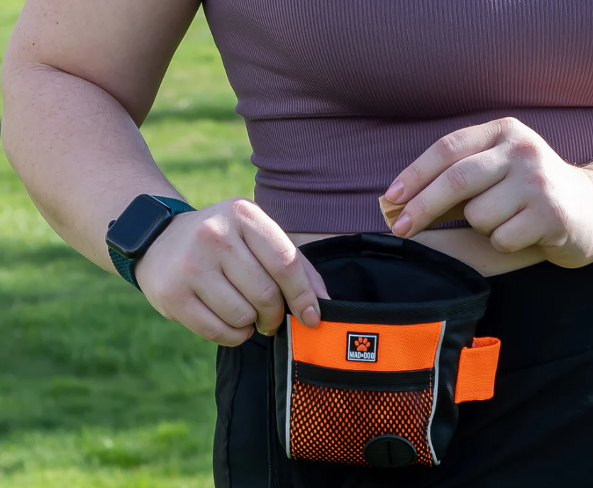 The Mad Dog Treat Traveler Bag is the perfect accessory for your next adventure! This lightweight bag features a special compartment for snacks, plus a sturdy adjustable strap for closure, and a waist clip for a no-carry solution. With this bag, you'll have no problem taking your pup on daring outdoor journeys.