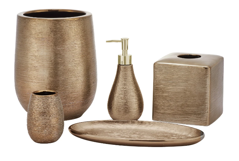 The Princess Bath Accessories Are A Beautiful Addition To Any Bathroom. The Textured Pieces Are Made Of Stoneware With A Metallic Electroplated Finish For A Subtle Shimmer. The Accessories Will Give Any Bathroom An Updated Look.