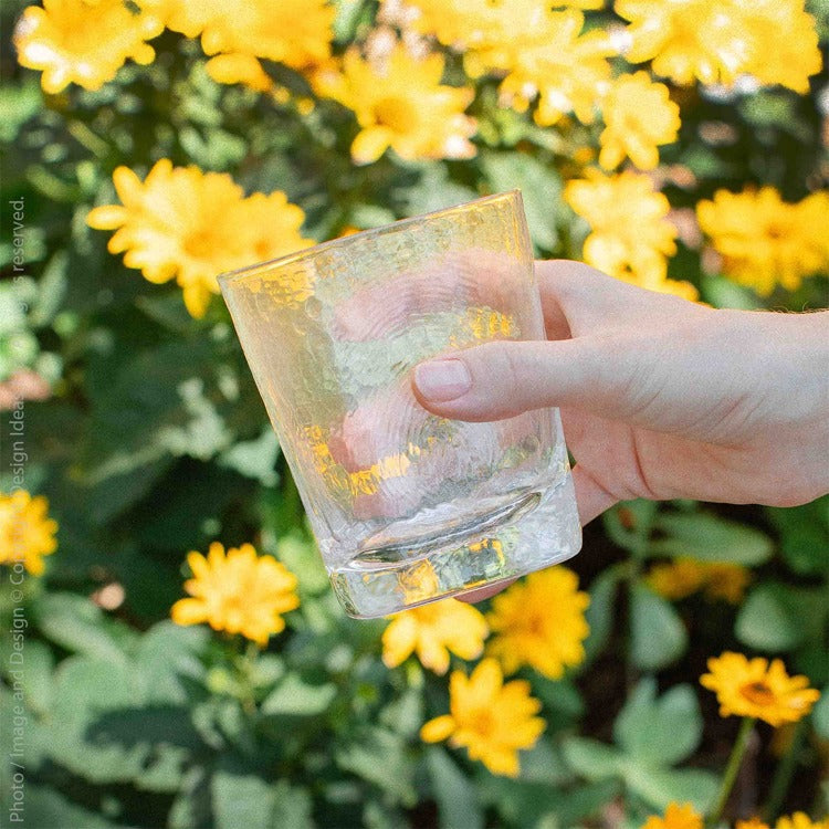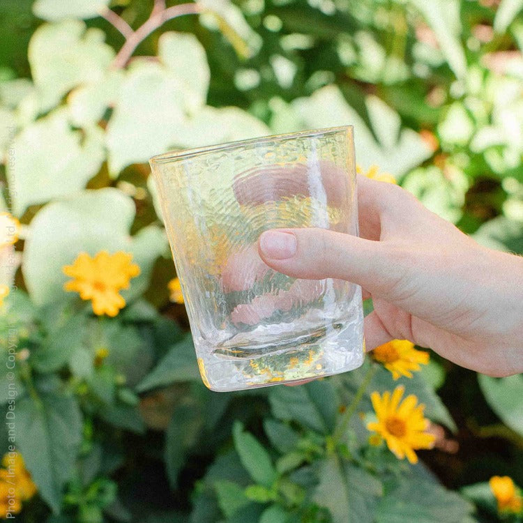 he Serapha™ Drinking Glass is an elegant way to enjoy your favorite beverages. With its unique triangular shape and exquisite hand-hammered texture, this collection seems worthy enough for a party of angels, hence the name Serapha™. This type of glass and design technique is sustainable and environmentally friendly. The generous curve of the smooth triangular shape makes for easy drinking, and the lowball style is perfect for concocting a cocktail, enjoying a nice sun tea, or even just a refreshing glass of water. The highball style is perfect for concocting a cocktail, enjoying a nice sun tea, or even just a refreshing glass of water. Whatever beverage you choose, this glass will enhance and delight!