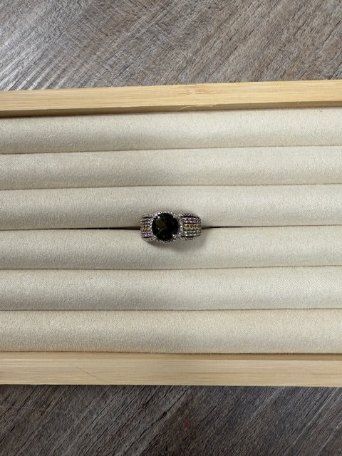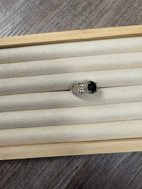 STERLING SILVER GREEN MOISSANITE W/PINK & YELLOW SPINEL CRYSTALS RING