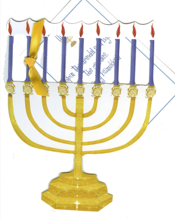 This greeting card package features a die-cut image that is hand-glittered and tied with a ribbon to the greeting card, which also bears the same image and is glittered. Also included is an envelope; all materials are carefully packaged in a cellophane envelope to protect the glitter and card. A copy of the greeting is also included in the back of the cellophane envelope.
