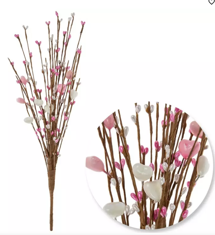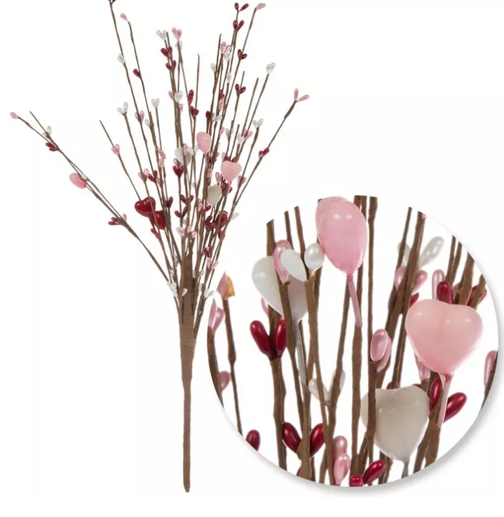 Enhance your faux floral arrangements for Valentine's Day with this Hearts & Berries Spray! This floral piece features a brown paper-wrapped stem with thin branches adorned with shiny hearts and berries. Use this stunning spray to bring a warm and fuzzy feeling to your romantic centerpiece.