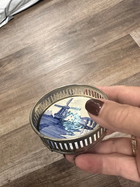 VINTAGE GERMAN STERNAUWARE DELFT BLUE HOLLAND WINDMILL PORCELAIN WITH SILVERPLATED RIM COASTERS